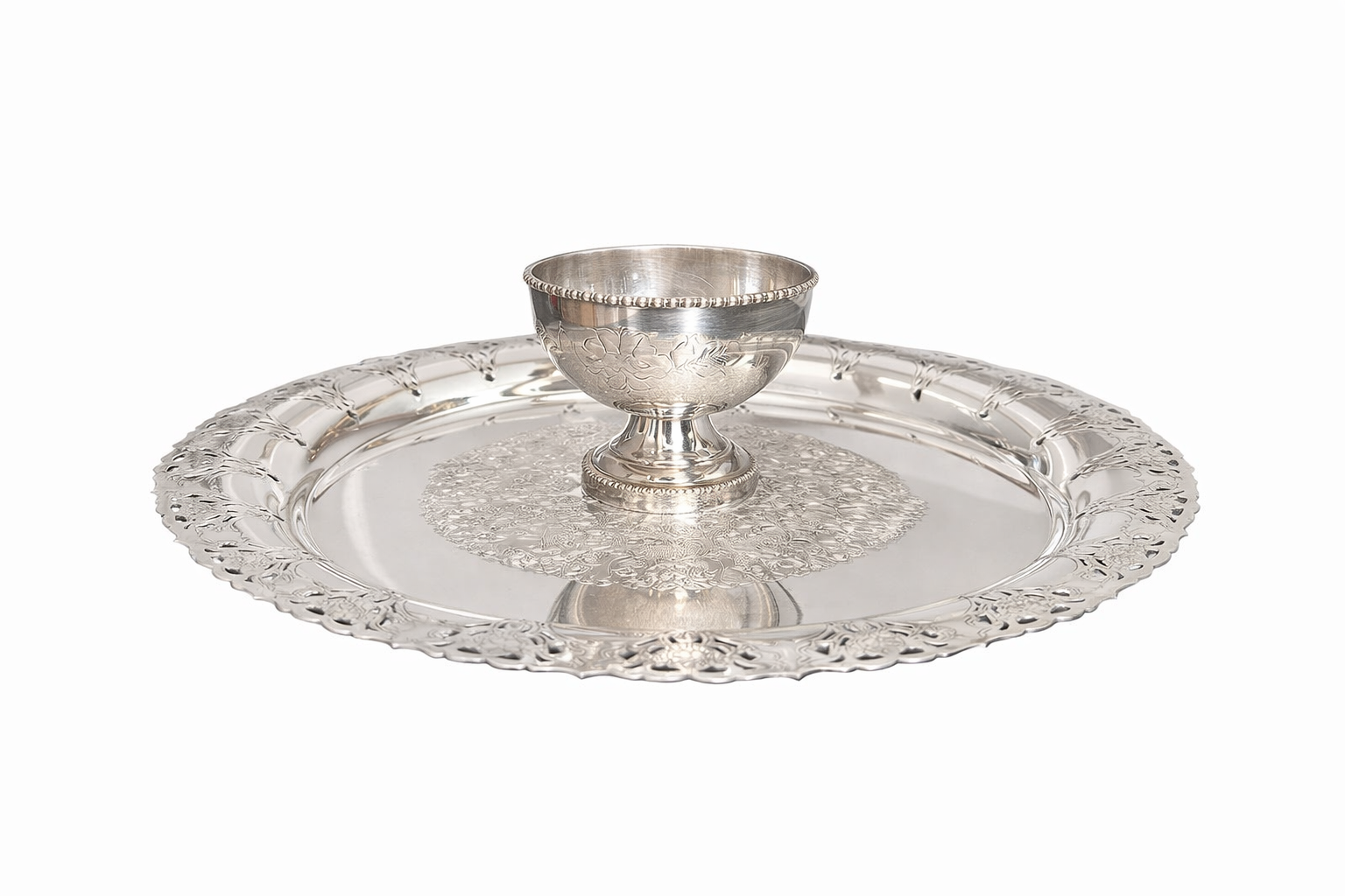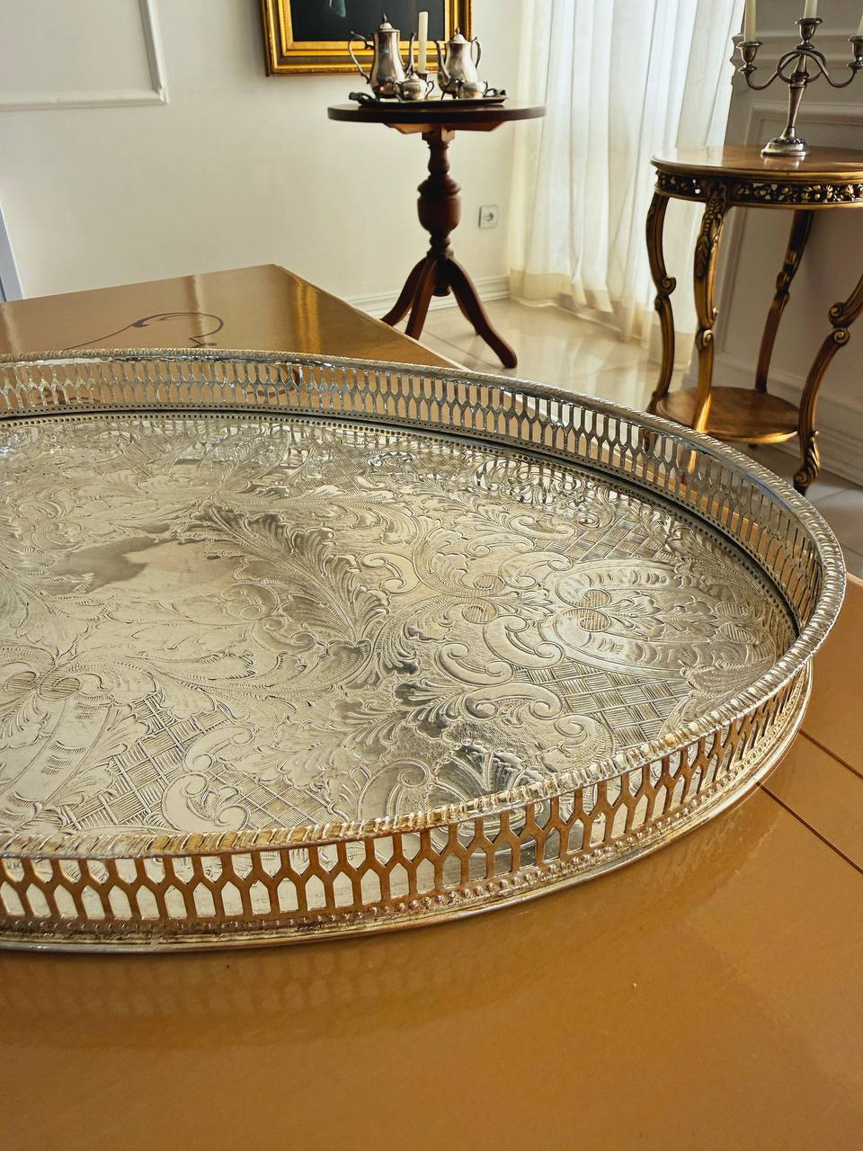 سینی پذیرایی دور توری کف قلمکاری آبکاری نقره فابریک – مناسب میوه و مزه